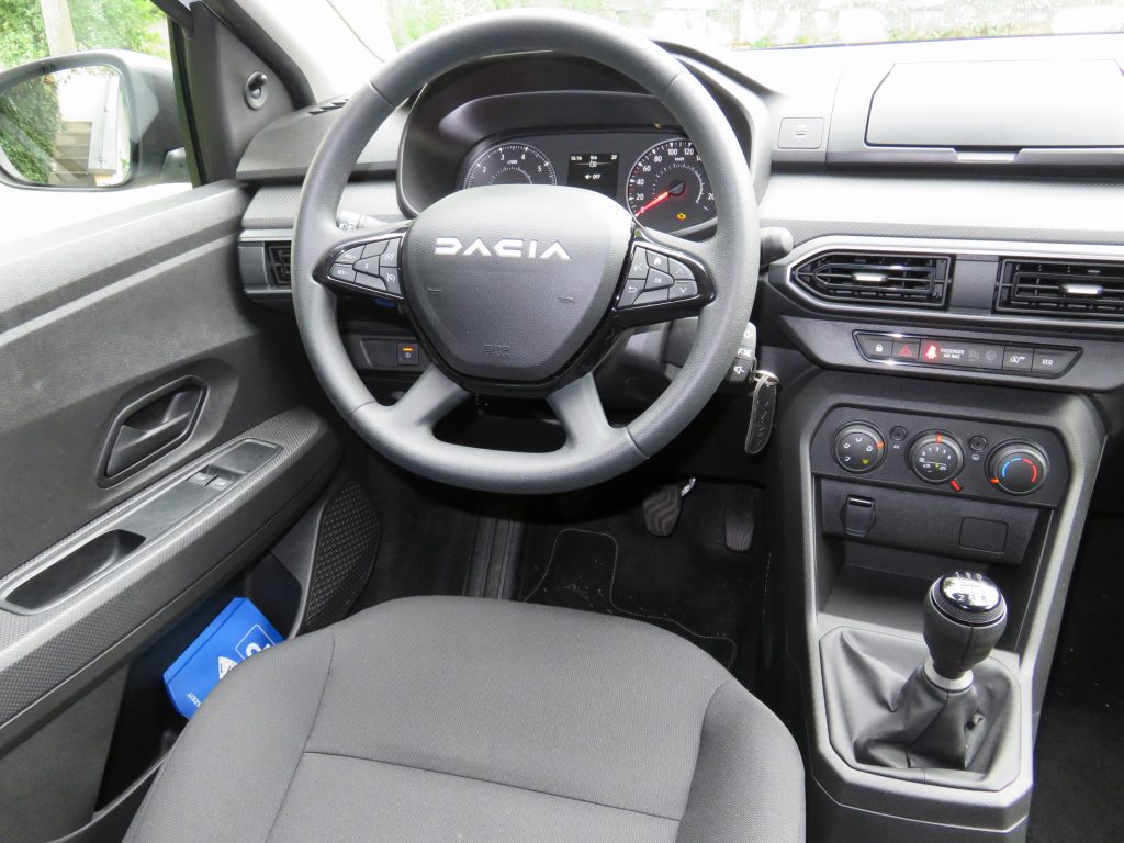 Wie fühlt man sich in diesem Auto? Auf unserem weiß lackierten Testwagen stand hinten der Dacia-Schriftzug ebenfalls in dieser Farbe, was dem Heck eine gewisse Eleganz verlieh. Die verschwand aber schnell wieder, sobald man in den Wagen einstieg. Denn hier ist alles zweckmäßig – durchaus hilfreich, wenn man ein Auto für die tägliche Fahrt von A nach B nutzt. Es gibt zum Beispiel drei Griffe am Dach für den Beifahrer und die beiden äußeren Mitfahrer im Fond, sehr praktisch, aber bei anderen Herstellern mitunter aus Kostengründen eingespart. Weggelassen im Sandero wurde der heutzutage üblich Bildschirm in der Mitte der Armaturentafel. Wir haben ihn nicht vermisst, denn die notwendigen Informationen lassen sich auf einem kleinen Feld zwischen den Rundinstrumenten abrufen – mit Hilfe von Druckknöpfen auf dem Lenkrad. Das gelingt leicht und führt nicht zur Ablenkung vom Verkehrsgeschehen, weil der Blick nach vorn zur Fahrbahn gerichtet bleibt. Keine Preisfrage dürfte die triste Farbgebung sein, bei der rundum Anthrazit eine mindestens langweilige Stimmung erzeugt. Wenigstens die Dachsäulen und den Dachhimmel hat man hell verkleidet. Wer meint, er könne seine Stimmung mit einer freundlichen Außenlackierung auflockern, der irrt: Den Sandero gibt’s derzeit nur farblos: weiß, grau und schwarz. Schade.