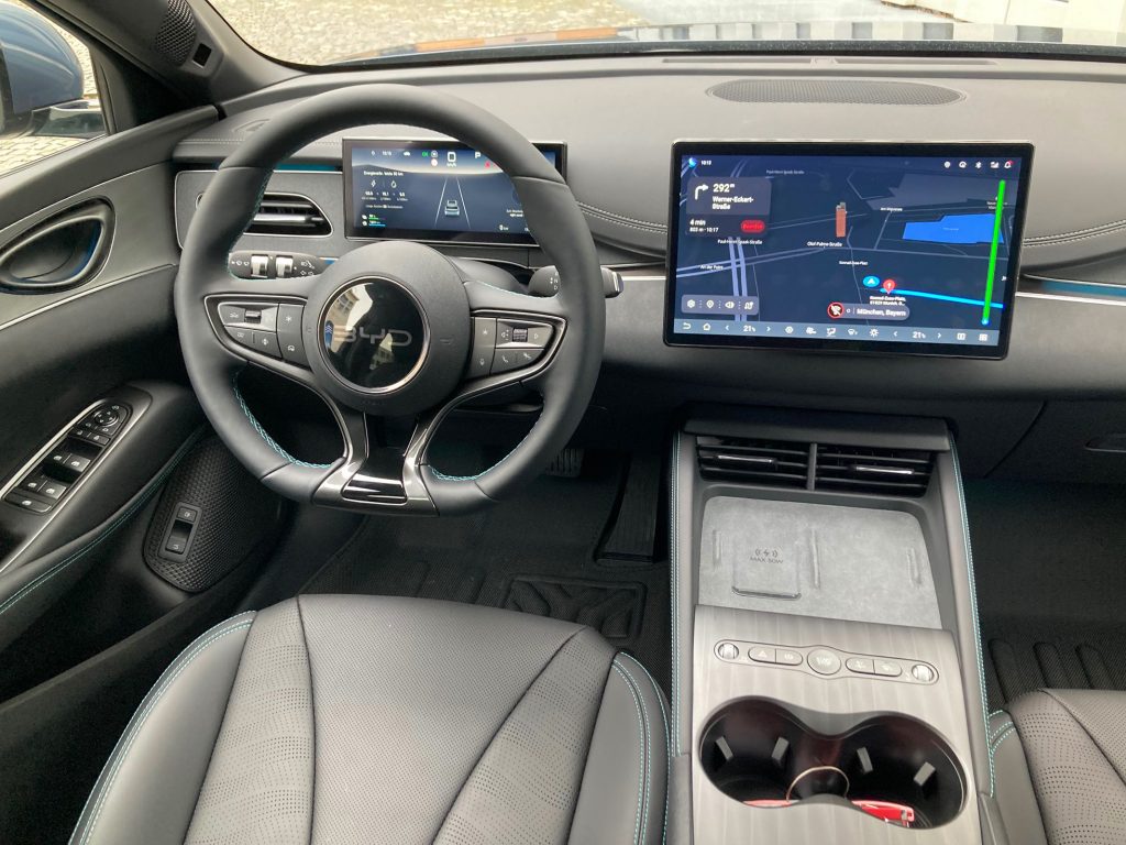 Praktisches Innenleben schlägt Lifestyle. Der Innenraum ist solide, aber abgesehen vom Panoramaglasdach ohne besonderen Feinschliff gestaltet. Auch das dürfte eventuell von Vorteil sein, denn anstatt womöglich einen so genannten Lifestyle-Kombi mit jeder Menge Schnickschnack aufzulegen, bekennt sich BYD zu praktischen Motiven. Das heißt, nicht alles muss nach verbreiteter hochmoderner Manier über den Bildschirm gesteuert werden. Es gibt Schalter und Knöpfe, auch Fensterheber und Spiegelversteller sitzen in den Türarmaturen – nicht etwa versteckt in Untermenüs am Touchscreen. Bravo! Zudem ein wichtiges Detail: Die Fahrtrichtung wird griffgünstig mit einem Hebel am Lenkrad gesteuert, was Platz auf der Mittelkonsole schafft.
