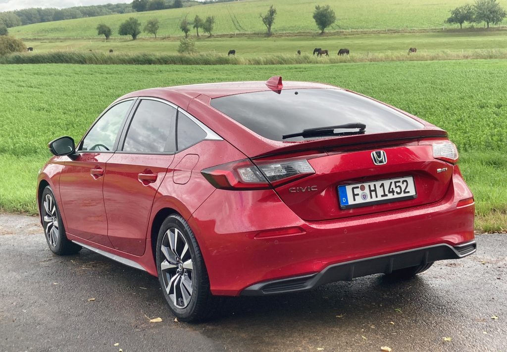 Regelung der Antriebskraft hauptsächlich durch E-Motor. Auf der ersten Testfahrt überzeugt einmal mehr der reibungslose Ablauf des Vollhybridsystems, bei dem Honda bekanntermaßen einen eigenen Weg geht: Mit seinem Zweiliter-Benziner und zwei Elektromotoren (einer als Generator und einer zum Antrieb) wird beim Civic eine maximale Systemleistung von 184 PS/135 kW erzeugt und ein höchstes Drehmoment von 315 Newtonmeter. Man kann die drei Spielarten der e:HEV-Technologie gut nachvollziehen: Beim Anfahren oder langsamem Stadttempo arbeitet nur der Antriebs-Elektromotor – allerdings am Stück nicht mehr als bis zwei Kilometer weit komplett batterieelektrisch; mehr gibt die kleine Pufferbatterie nicht her.
