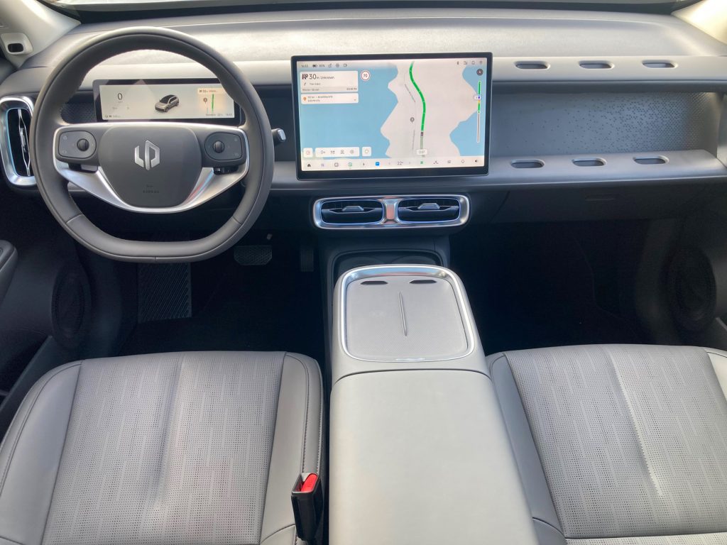 Fahrprogrammvielfalt mit Hürden. Kaum verwunderlich, dass der B10 ohne Startknopf bereit ist. Die Fahrstufe wird direkt am Steuer über einen etwas altmodisch wirkenden, aber griffgünstig angebrachten Hebel eingelegt. Vorher muss man aber noch mühsam die Spiegel einstellen, wozu ein Herumfummeln auf dem Bildschirm und danach das Justieren per Steuerungstasten auf dem Lenkrad nötig ist. Am besten vergewissert man sich gleich noch für den Fall der Fälle, dass der Warnblinkschalter im Dach sitzt. Schließlich surrt der Hecktriebler flüsterleise los und kann über drei Fahrprogramme zu gemütlicherer oder zubeißender Gas- und Lenkbefehl-Annahme beeinflusst werden. Auch die Energierückgewinnung ist in drei Stärken anwählbar – noch gibt es keine One-Pedal-Rekuperation, also bis zum Stillstand. Aber sie soll nächstes Jahr per Software eingespielt werden. Etwas früher findet laut Leapmotor die Apple- und Android-Anbindung den Weg ins Fahrzeug. Bei aller ausgeklügelten Bedienungslogik gerät unterwegs eine wesentliche Schwachstelle deutlich in den Blickpunkt, womit Leapmotor allerdings nicht allein dasteht: Den Wechsel von Fahrprogrammen und Rekuperationsstufen muss man am Bildschirm anwählen. Das lenkt jedes Mal ziemlich ab – und wäre mit Direktschaltern intuitiv sicherer zu managen. Mutmaßlich würde dies bestimmt zu einem häufigeren, da unkomplizierteren Nützen dieser gut funktionierenden Programmunterschiede führen.