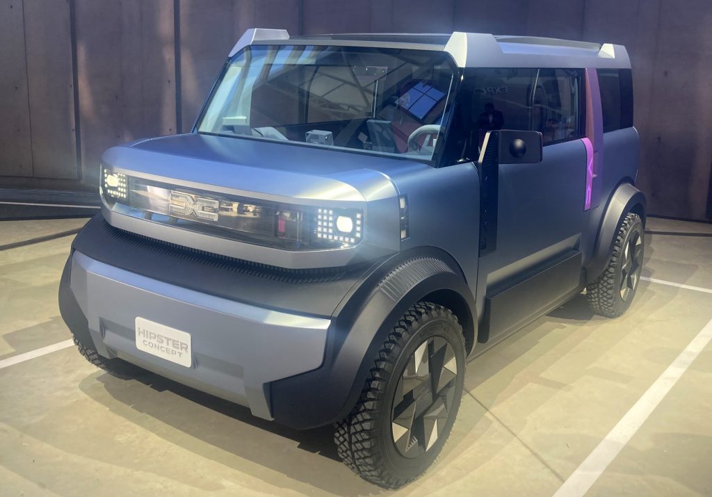 Starker Auftritt von der ersten Sekunde an. Das Konzept eines phantasievoll modularen Aufbaus springt einem unwillkürlich ins Auge – von der kleinteiligen Zusammensetzung wie mit Legosteinen ineinandergesteckt bis hin zu einem blockartig geschrumpften Land Rover Defender. Klar ist: Das Miniformat kommt echt cool rüber: Entgegen gängiger Präsentationen ausgewiesener Technologieträger oder eben internationaler Concept Cars, die mucksmäuschenstill dastehen und schließlich durch mehr oder weniger würdige Hände von ihrer Stoffverhüllung befreit werden, biegt der Hipster frech um die Ecke. Er dreht zwei Runden um die wartende Fotomeute und steht dann gewohnt statisch auf der Präsentationsfläche. Von diesem Moment an gilt striktes Berührungsverbot „Don’t Touch!“. Man darf weder die Türen noch den Kofferraum selbst öffnen oder schließen. Dies übernehmen vier autorisierte Hände, damit nichts schief geht. Immerhin: Man darf sich hineinsetzen und alles betrachten.