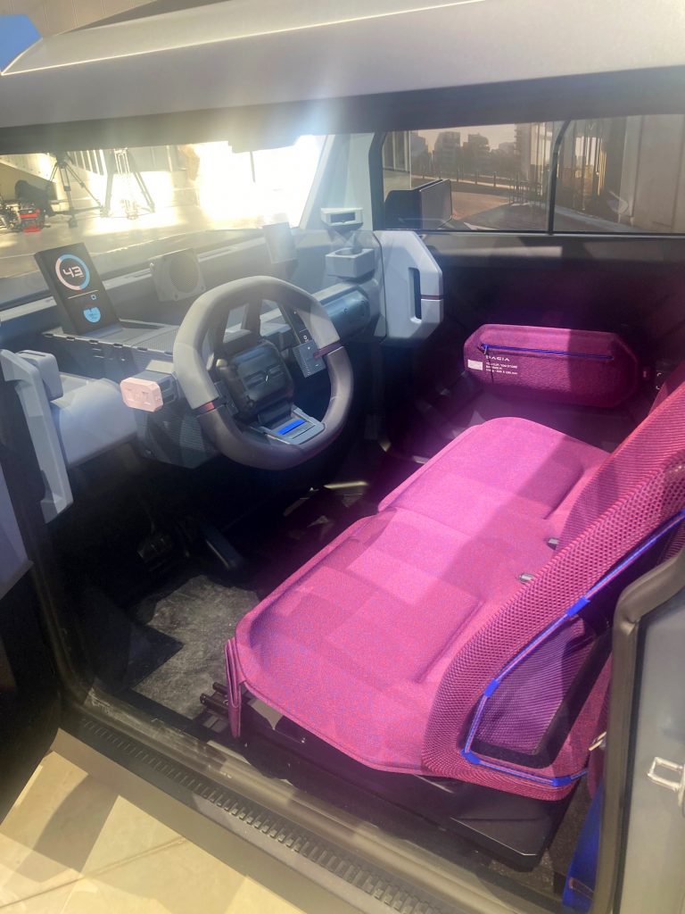 Der Hipster gilt als vollwertiger Viersitzer. Das vordere Gestühl sieht aus wie eine knapp durchtrennte Zweierbank. Natürlich war nur eine kurze Sitzprobe möglich, aber die netzartige Bespannung ist beim ersten Eindruck erstaunlich bequem, passt obendrein perfekt zum nicht weniger beeindruckenden Sitzgestänge. Citroen 2CV und der Fiat Ur-Panda lassen grüßen. Hier hat die Leichtbau-Abteilung jedenfalls ganze Arbeit geleistet. Laut Dacia wiegt der Hipster rund 800 Kilogramm. Leichtgewichtige Lösungen stehen neben dem münzenklingelnden Sparstrumpf überall im Vordergrund. Selbst zwei Außenspiegeleinsteller sucht man vergebens – zumindest bei der Fahrzeug-Studie. Gerade noch rechtzeitig, bevor der Zeitplan das Aussteigen gebietet und eine unsichtbare Hand von außen die Tür öffnet, kann man erkennen, dass die seitlichen Fenster geschoben werden müssen, wenn man sie denn öffnen möchte.