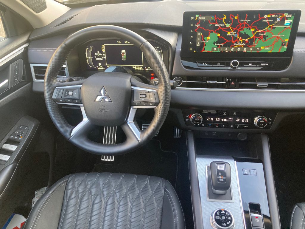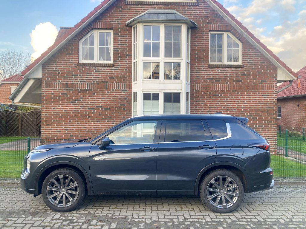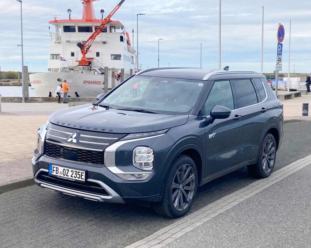 Was kostet dieses Auto? Der Mitsubishi Outlander steht ab 46.990 Euro in der Preisliste und schraubt sich in fünf Ausstattungsstufen auf 58.490 Euro nach oben. Wir hatten die viertbeste Linie namens Top im Test. Hier sind neben zahlreichen aufpeppenden Äußerlichkeiten unter anderem auch folgende Annehmlichkeiten an Bord: 20-Zoll-Reifen, Scheinwerferreinigungsanlage, Fensterverdunkelung in der zweiten Reihe, elektrische Heckklappe, Ledersitze mit Heizung und Kühlung, digitaler Innenspiegel, Panoramaglasschiebedach, Head-up-Display, Klimaautomatik, Ladeschale fürs Mobiltelefon und Soundanlage mit zwölf Lautsprechern.