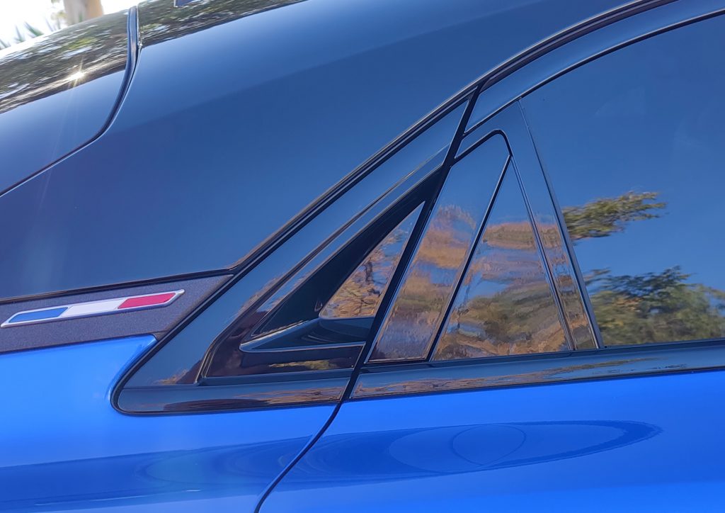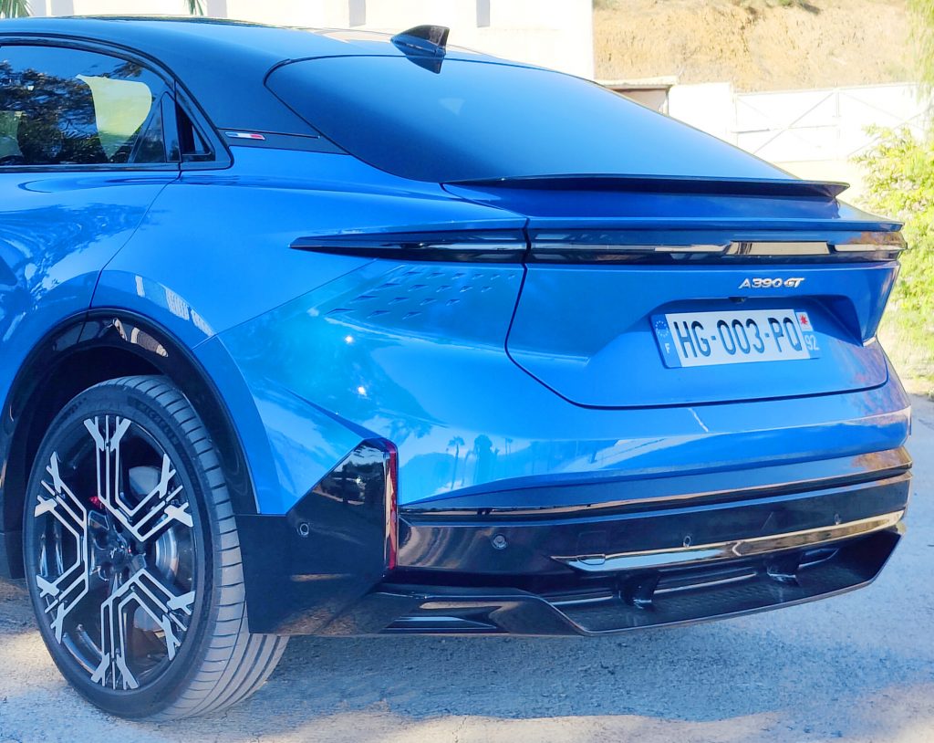 Außen. Von vorn wirkt die Alpine A390 wohlproportioniert, keineswegs bullig. Die 1,53 Meter Höhe merkt man ihm nicht an. Links und rechts vor den Rädern gibt es Lufteinlässe, um so genannte Air Curtains zu erzeugen: Bei höheren Geschwindigkeiten legt sich ein Luftpolster um die Räder und senkt deren Luftwiderstand. Hinten fällt ein Spoiler auf, der in die Heckscheibe integriert ist. Die vorderen Türgriffe sind versenkt, hinten verstecken sie sich im oberen Teil der Scheibe. Mit diesen und anderen Maßnahmen wird ein Luftwiderstandsbeiwert von 0,26 erreicht.