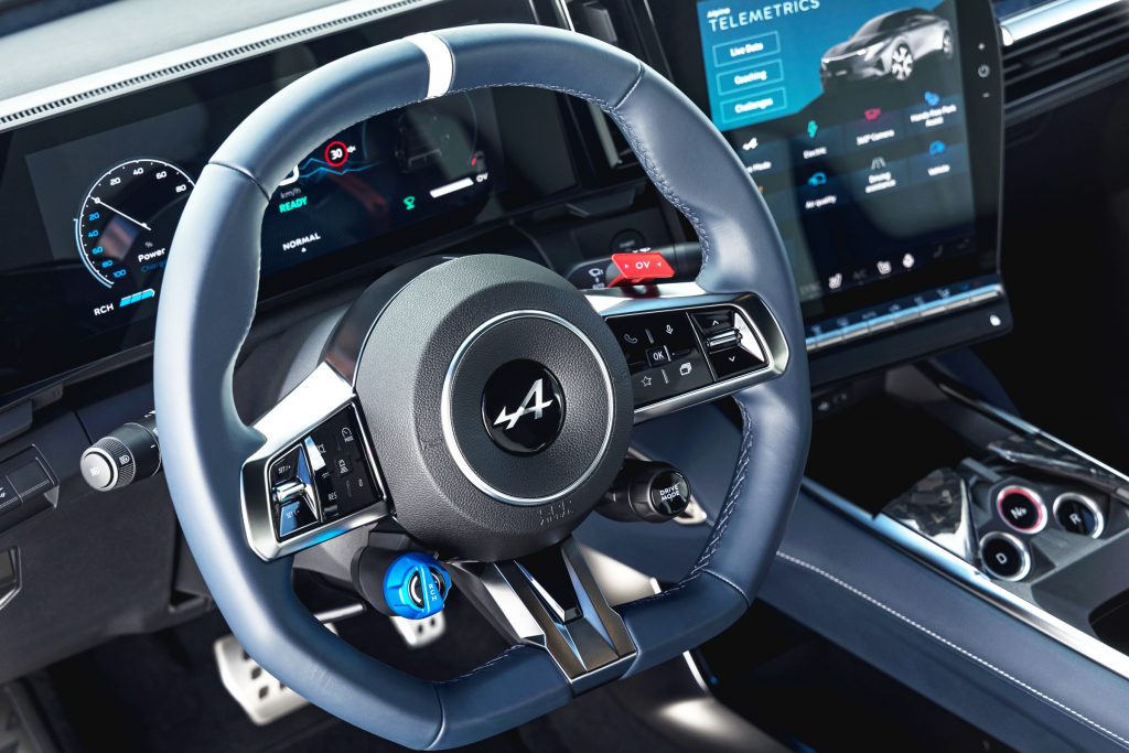 Antrieb. Vorne gibt es einen Elektromotor, hinten deren zwei. Um das massive Drehmoment von 824 Newtonmeter ausgeglichen auf Vorder- und Hinterachse zu verteilen, kommt das Alpine Torque Pre Control System zum Einsatz. Um darüber hinaus die beiden hinteren Motoren in ihrer Leistung anzugleichen, wurde das Active Torque Vectoring entwickelt. Dadurch wird das notwendige Drehmoment je nach Fahrsituation immer ans richtige Rad verteilt, worauf man bei Alpine besonders stolz ist. Weitere elektronische Feinheiten: In den Fahrprogrammen Normal, Sport und Track soll die Steuerung Lastwechsel minimieren; mit Track sind sogar Drifts möglich, ohne dass man gegenlenken muss.