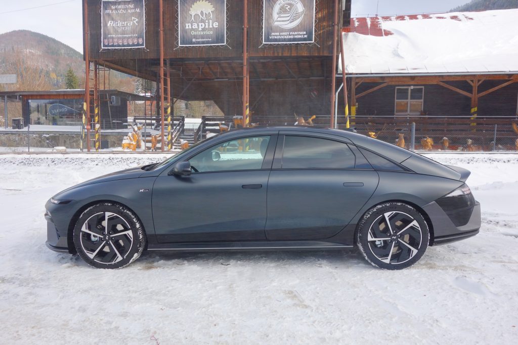 Im Schnee. Hinter Frýdlant nad Ostravicí (deutsch: Friedland an der Ostrawitza) fahren wir über die Schnellstraße R 56 auf fester Schneedecke, abgestreut mit grobem Split, und erfreuen uns an der unbeirrt sicheren Fahrt. Denn unser Ioniq 6 ist eine der Ausführungen mit Allradantrieb. Sanft, kaum spürbar, greifen die elektronischen Fahrhilfen ein und vermitteln so selbst bei angepasster zügiger Fahrt ein wohltuendes Gefühl der Sicherheit. Eine schmucke Holzkapelle als Fotohintergrund will durch tieferen Schnee angefahren werden – auch das gelingt tiefenentspannt. Noch laufen die Lifte nicht, aber es scheint, als könne es schon morgen in einem der malerischen Dörfer mit dem Skifahren losgehen. Wir hätten noch stundenlang durch dieses malerische Winter-Wunderland fahren können, doch bald hinter Staré Hamry (Althammer) kommt der Grenzübergang in die Slowakei, und mit dem Schnee ist es vorbei.