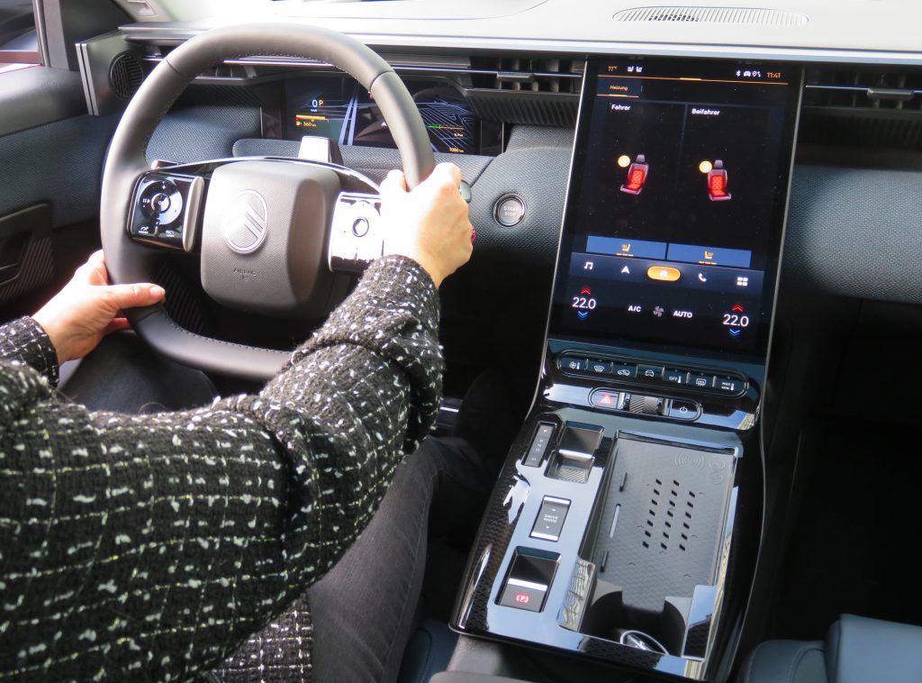 Tolle Platzverhältnisse, zurückhaltendes Innenraumkonzept. Das Cockpit ist zweckmäßig ausgelegt. Die meisten Funktionen werden über den senkrecht angebrachten berührungsempfindlichen Bildschirm in der Armaturentafelmitte gesteuert. Für Klimafunktionen und Lautstärkeregelung gibt es darunter eine extra Leiste. Ablageflächen hat’s genug, die sichtbar größte ist dem Mobiltelefon vorbehalten. Kleinteilig-fummelig harrt links daneben die Automatik-Schaltkulisse – Massenware aus dem Stellantis-Konzern. Das unten abgeflachte Lenkrad macht sich ganz gut, auch die darauf befindlichen Bedienoberflächen für den Bildschirm vor dem Steuer sind tadellos.