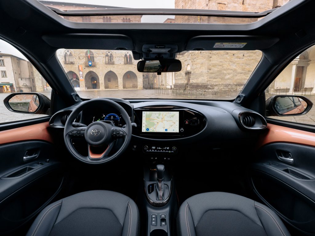 Neues Kapitel mit Hybrid: Statt wie bisher mit dem bewährten Einliter-Motörchen (72 PS/53 kW) und Handschaltung fährt der 3,78 Meter lange Aygo X nun mit Hybridtechnologie und CVT-Automatik durch die Gegend. Die Leistung steigt auf 116 PS/85 kW, der Verbrauch sinkt auf 3,7 Liter Super je einhundert Kilometer (was 85 Gramm CO2/km entspricht). Damit unterbietet der Aygo X Hybrid den größeren Yaris Hybrid um 0,1 Liter Super auf einhundert Kilometer und zweiGramm CO2 pro Kilometer. Auf ersten Testfahrten gefielen uns die um einige Zoll gewachsenen Bildschirme im Cockpit und das auf Wunsch erhältliche Faltdach, das für etwas Cabrio-Feeling sorgt.