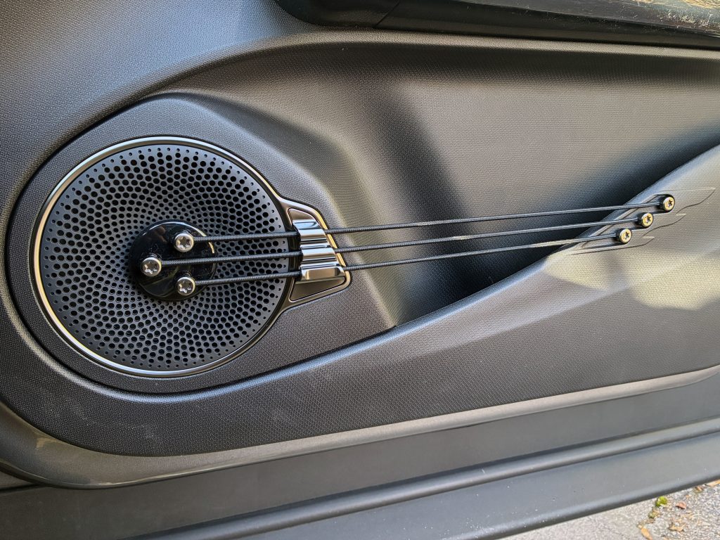 Wie fühlt man sich in diesem Auto? Wie ein Rockstar. Denn Luftgitarren sind an Bord des Atto 3 überflüssig: In allen vier Türen stecken E-Gitarren in den Verkleidungen. Naja, zumindest sieht die Kombination aus Lautsprecher und Staufach exakt so aus. Werden die jeweils drei Saiten gezupft, erklingt tatsächlich ein Ton, der als Musik durchgehen kann. Die Gummi-Schnüre sind auch dazu gedacht, Flaschen und andere Gegenstände zu fixieren.