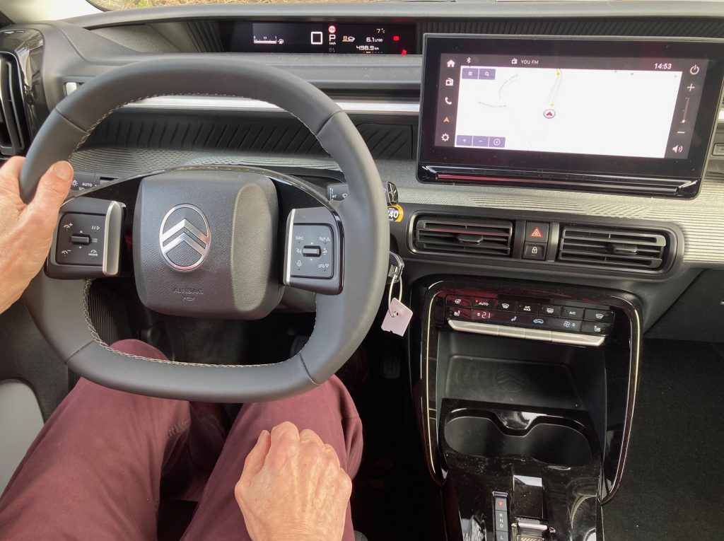 Wie fühlt man sich in dem Auto? Kaum setzt man sich in einen französischen Wagen, steigt automatisch die Erwartungshaltung, in weiches Gestühl niederzusinken. Das müssen wir mit der Muttermilch eingesogen haben, ein kollektives Überbleibsel der längst vergangenen 2CV-Entenepoche. Und was stellen wir tatsächlich fest? Der Sitzkomfort ist von der ersten Sekunde an gut, die Sitze sind angenehm elastisch und bieten auch nach längeren Strecken über Landstraßen den klassenüblichen Seitenhalt; eindeutiger Pluspunkt! Bordübliche Infos sucht man im Aircross vergeblich hinterm Steuer, geschweige denn Rundinstrumente. Hier geht Citroen einen hochmodernen Weg: Alle notwendigen Informationen sitzen digital angezeigt und prima einsehbar in einem schmalen Schacht zwischen Windschutzscheibe und Armaturentafel. Super Idee, denn die Blickrichtung ist perfekt, und man braucht kein teuer in die Windschutzscheibe eingespieltes Head-up-Display. Peugeot fährt einen ähnlichen Kurs schon länger, und selbst klar zugeordnete Premiumanbieter wie Volvo bringen solcherart angeordnete Anzeigen erstmals beim EX60 bald auf den Markt. Die Ausgewogenheit zwischen berührungsempfindlichem Bildschirm und einer extra Schalterleiste für den täglichen raschen Funktionszugriff zu allen Klimaeinstellungen ist passend. Sie sitzt im Vergleich zu allem anderen allerdings recht weit unten in der Mitte der Armaturentafel; genau genommen unterhalb dieser Fläche.