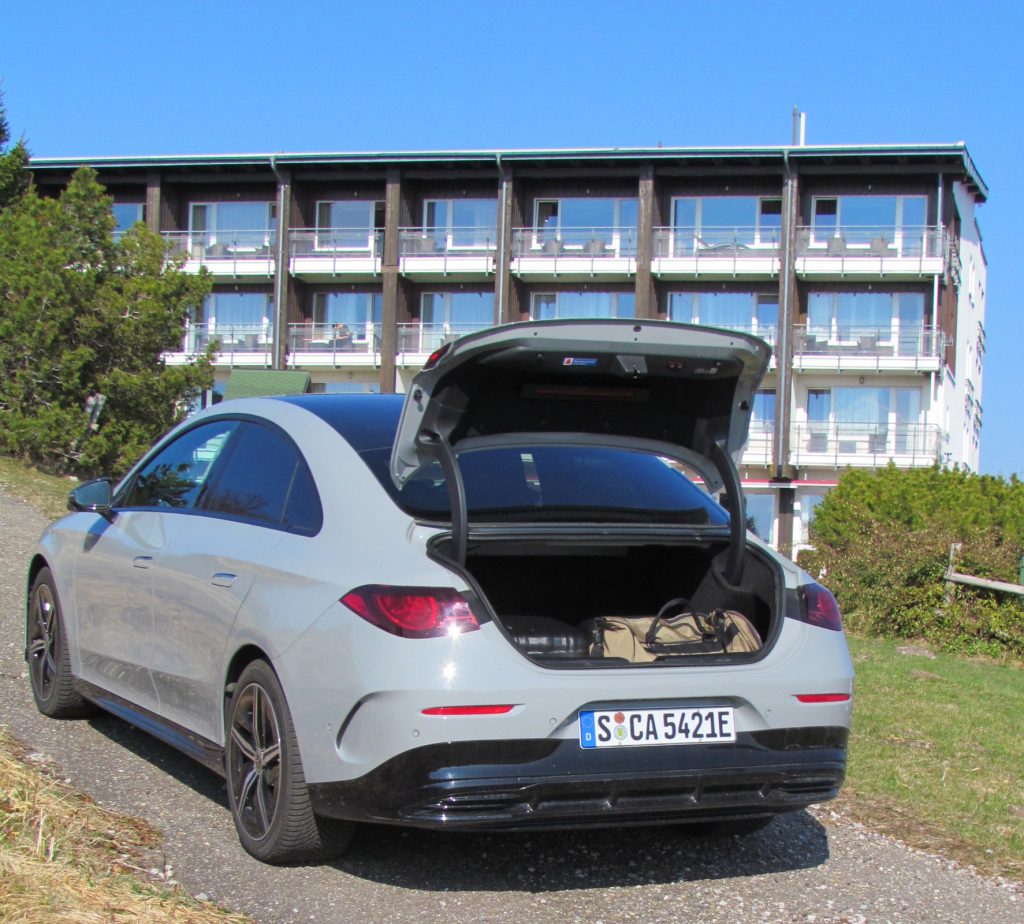 Was kann man in diesem Auto mitnehmen? Der 405 Liter fassenden Gepäckraum im Heck mit einer Ladekante in Höhe von 76 Zentimetern wird durch ein 101-Liter-Staufach unter der vorderen Haube ergänzt, unter die außer dem Ladekabel auch noch ein handlicher Rollkoffer passt. Das Heck hätte natürlich statt durch eine kurze Klappe auch durch eine, die bis zum Dach reicht, zugänglich gemacht werden können. Aber damit wäre dem CLA Shooting Brake die Butter vom Brot genommen worden – der Edelkombi bietet genau dies, nämlich zum Aufpreis von 1.369 Euro praktischeren Zugang zu größerem Stauraum. So können CLA-Fahrer nichts Sperriges mitnehmen, weil die Ladeöffnung nur eine Höhe von höchstens 40 Zentimeter zulässt.