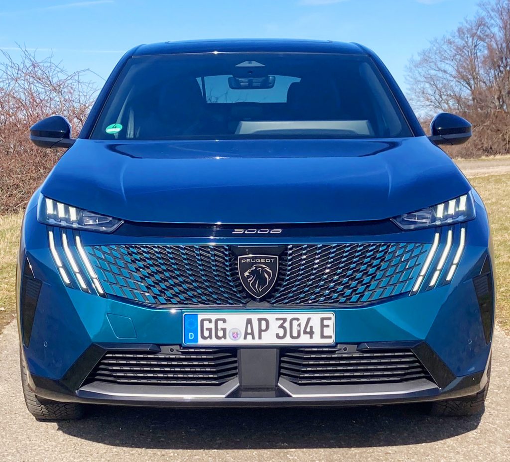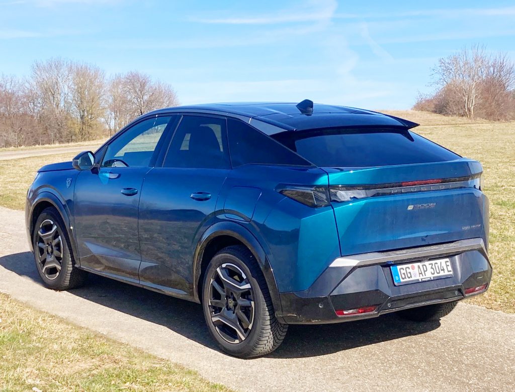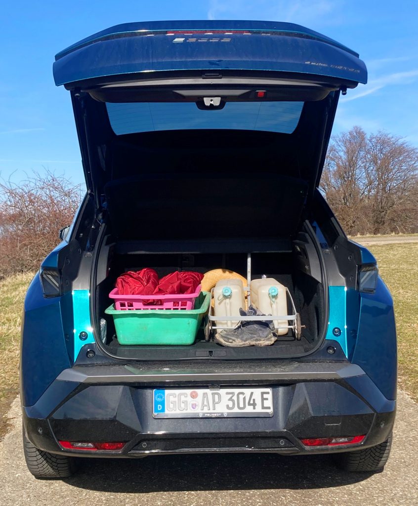 In jedem Fall erregt der E-3008 Aufmerksamkeit, und das liegt nicht allein an der auffälligen blauen Lackierung unseres GT-Testwagens. Die wabenartige Maske samt der jeweils dreikralligen Tagfahrlichter und ebensolcher LED-Scheinwerfer am Bug ziehen die Blicke auf sich – mittendrin der brüllende Löwenkopf als Peugeot-Markenzeichen: stark! An den Flanken überwiegt gängiges glatt gebügeltes Blech. Das Heck mit seiner Mischung aus abfallender Dachlinie, zackigem Dachspoiler, kleinem Fenster und blockähnlich abgeschnittener Karosserie zeigt sich als raffiniert gestaltete Schokoladenseite. Das Beste für den alltäglichen Gebrauch: die große Klappe zum Beladen des Kofferraums. Was wir aber nicht verhehlen wollen: Unser Allrad-3008 hat einen Gepäckraum von 470 – 1.430 Liter. Die Single-Motor-Ausführung mit Frontantrieb bietet bei aufgestellten Lehnen im Fond 520 Liter, maximal passen 1480 Liter bis unters Dach.