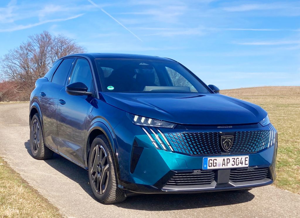 Welchen Antrieb hat das Auto? Da haben wir eine echte stromernde Leistungskrone gefahren: den allradgetriebenen E-3008 Dualmotor 325 AWD. Während nämlich die Elektro-Fronttriebler wahlweise mit 213 PS/157 kW oder 231 PS/170 kW ausgestattet sind, hatte unser Allradler zwei E-Motoren an Bord: vorne mit 213 PS/157 kW und hinten mit 113 PS/83 kW – Systemleistung: kraftvolle 325PS/239 kW. Man muss sich aber das Fahrzeug nicht wie einen übersatten Rennboliden vorstellen, schon gleich gar nicht als hypernervöses Rennpferd. Mit einem Leergewicht von rund 2,3 Tonnen steht der Wagen erst mal ganz solide auf seinen zwei angetriebenen Achsen. Längst hat es sich auch herumgesprochen, dass man mit dem wertvollen Strom kein Schindluder betreiben sollte, weil sich dies außer höheren Kosten einmal mehr als reichweitenverkürzendes Merkmal entpuppen könnte. Hier macht dieser Peugeot keine Ausnahme, auch wenn sein Höchsttempo anders als bei den beiden frontgetriebenen Elektrikern statt bei 170 km/h erst bei 180 km/h abgeregelt wird.