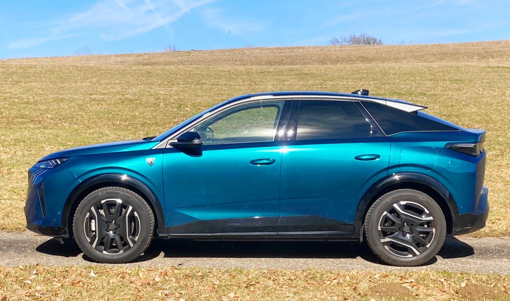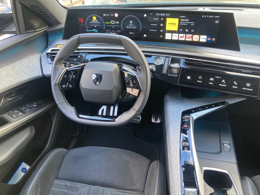 Was bietet einem dieses Auto? Wir wollen noch einen Begriff ins Spiel bringen, der von Verkaufsstrategen bei Fahrzeugen der Mittelklasse gerne verwendet wird: Lounge-Atmosphäre. Da hat der E-3008 schon etwas zu bieten, allem voran die luftigen Platzverhältnisse, ein nach wie vor ungewöhnliches Cockpit mit feinen Materialmischungen. In der GT-Ausstattung besticht die nicht nur schmallippige Ambientebeleuchtung unter dem gebogenen 21-Zoll-Trapez-Bildschirm. Was wir wiederum als grenzwertig empfunden haben: Das mithin eher straff abgestimmte Fahrwerk – oder sind wir da zu sehr in französischer Erwartungshaltung? Unterwegs spielten wir weniger mit den Fahrprogrammen, die von sanft und wirtschaftlich gleitend bis hin zu knackig zupackend nach Lust und Laune zu justieren sind. Leistung hat das kompakte Zwitter-SUV-Coupé sowieso in Hülle und Fülle. Angenehm über die Lenkradpaddles zu bedienen sind die unterschiedlichen Rekuperationsstufen. Das ist praxisnah und gab uns ein gutes Gefühl zur Bremsenergierückgewinnung.
