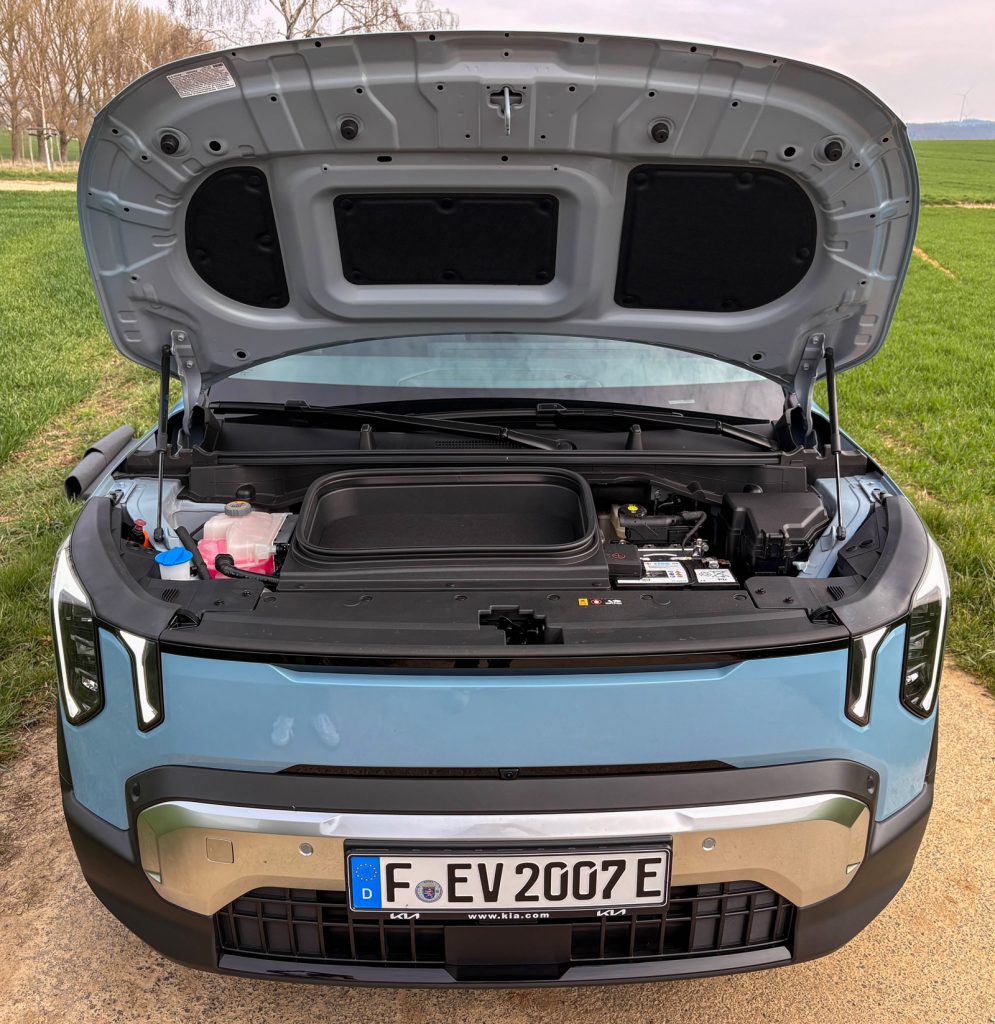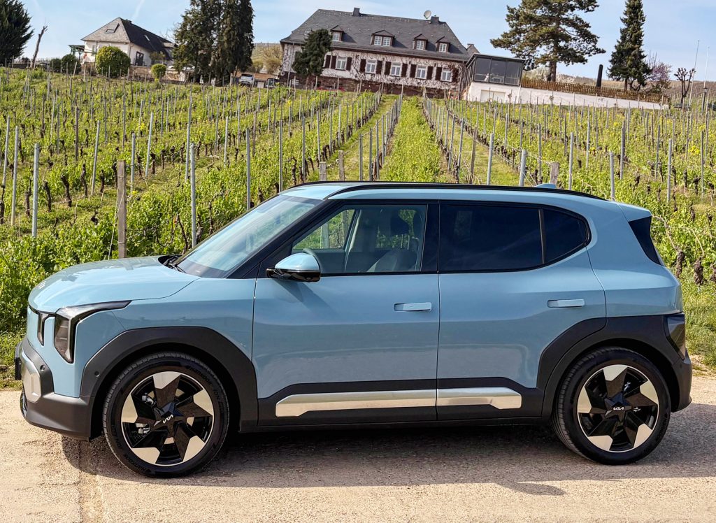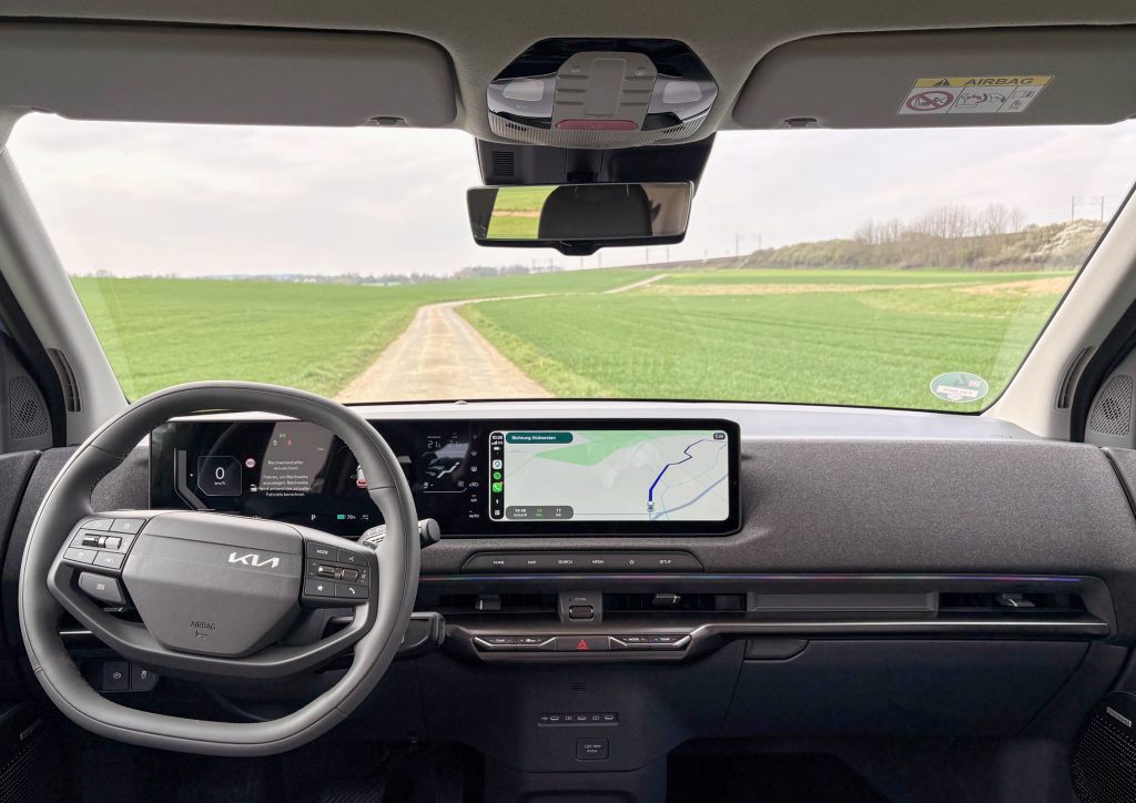 Unterwegs mit der Standardbatterie. Fahrer und Beifahrer finden auf bequemen, vielfach verstellbaren Sitzen sehr einfach eine angenehme aufrechte Position. Durch die ziemlich steile Frontscheibe entsteht ein großzügiges Raumgefühl, der Fußraum vorn und die Kopffreiheit sind absolut ausreichend. Die Rundumsicht ist relativ gut, die etwas eingeschränkte Sicht nach hinten wird durch eine Rückfahrkamera ausgeglichen. Dankenswerterweise projizieren Kameras in den Seitenspiegeln beim Einparken und beim Fahrspurwechsel eine Seitenansicht des Fahrzeuges ins Zentraldisplay, was wir als angenehm und sicherheitsfördernd empfunden haben. Der Kia EV2 wird in zwei Batterievarianten angeboten. Der Standard-Akku mit 42,2 kWh versorgt einen 146 PS/108 kW leistenden Elektromotor mit Strom und ermöglicht eine Reichweite bis zu 317 Kilometern.